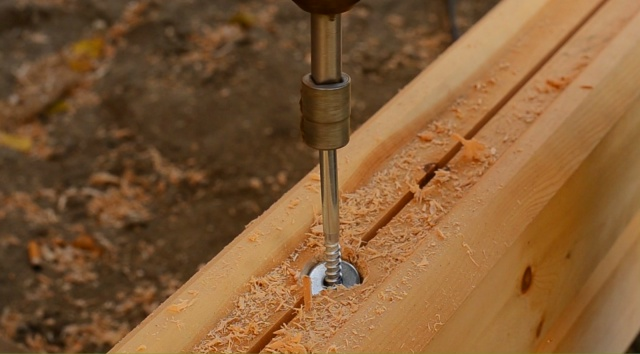 Болт-«глухарь». В брусе сверлится отверстия по диаметру резьбы «глухаря». Болт, имеющий шестигранную головку, ввинчивается в отверстие с помощью гайковерта. Болт-«глухарь» – это специализированный саморез из высококачественной углеродистой стали с защитным цинковым покрытием. Его особенность – это глубокая и редкая резьба, которая обеспечивает надежное сцепление с древесиной без риска раскалывания материала. Этот способ – некая «золотая середина» – он достаточно надёжен и относительно недорог